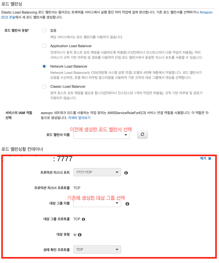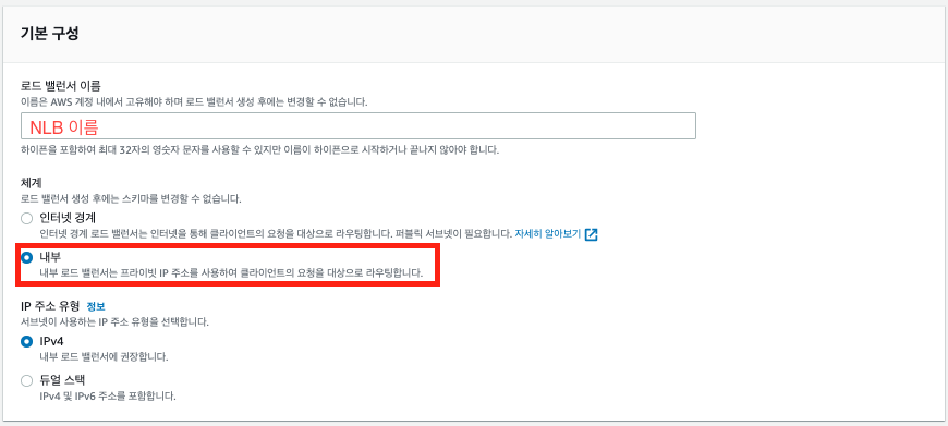 외부에서 들어오는 요청을 7777 포트와 7070 포트로 Load Balancing 해줄 것이기 때문에 NLB를 생성합니다. 외부에서 접속할 NLB이기는 하지만 우선 private subnet에 생성하도록 하겠습니다.