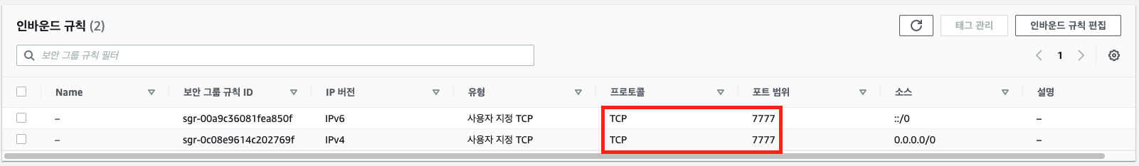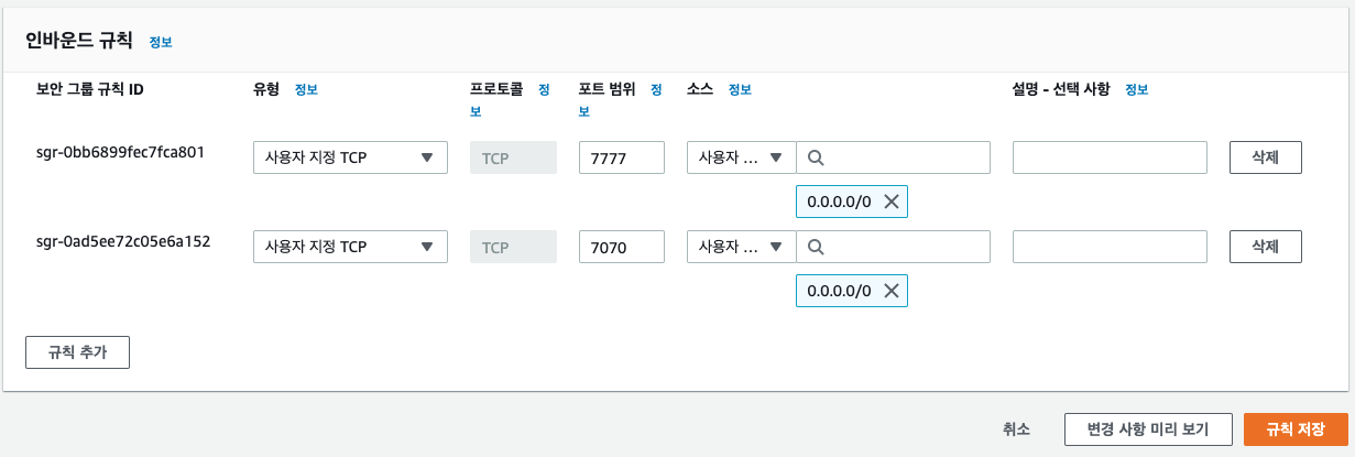 ECS 클러스터를 생성하기 전 미리 클러스터 보안 그룹을 생성합니다. 인바운드 규칙으로 7777, 7070 포트를 열어줍니다.
