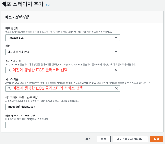 배포 스테이지에서 이미지 정의 파일의 경우, buildspec.yml 파일에 지정한 최종 빌드 artifacts 파일의 이름을 적어주면 됩니다.