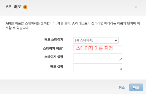 이후 이렇게 생성한 API를 배포합니다. "작업 > API 배포"를 클릭한 뒤 기존 배포 스테이지 또는 새로운 배포 스테이지를 생성하여 배포를 진행합니다.