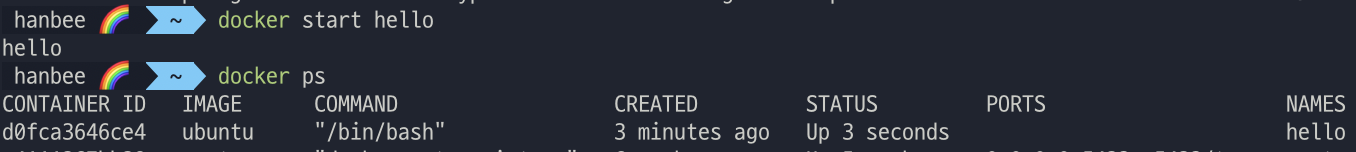 컨테이너 시작 docker start <컨테이너 이름>