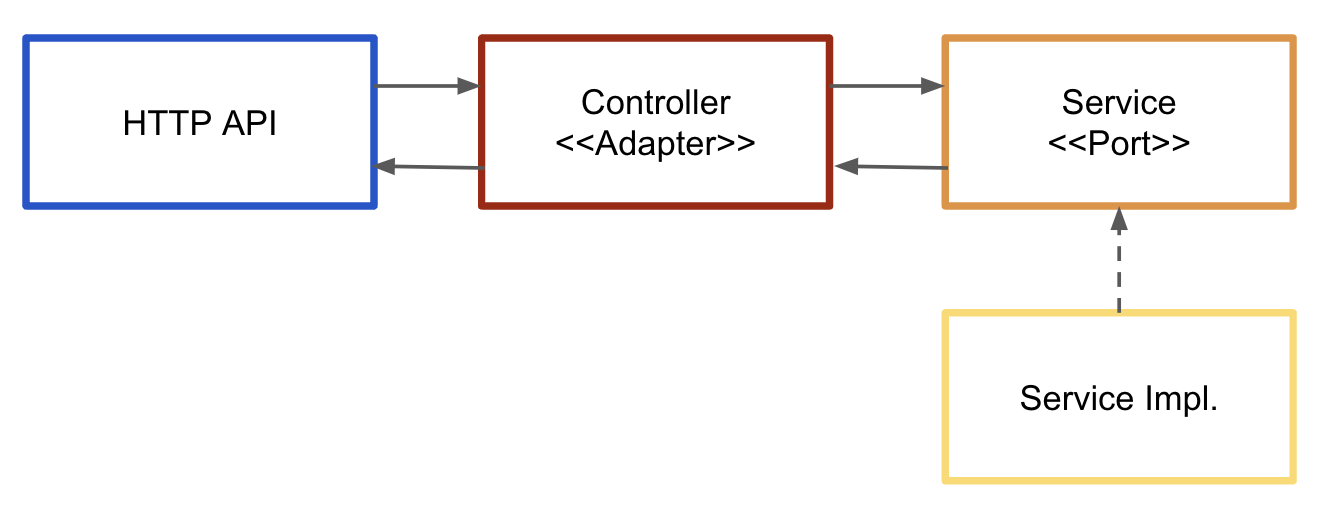 이때 서비스는 인터페이스를 제공하므로 포트입니다. (자세히 살펴보면 서비스가 제공하는 메서드가 포트!) 컨트롤러는 클라이언트의 요청을 받아 서비스의 메서드를 연결해주고 있기 때문에 어댑터입니다.