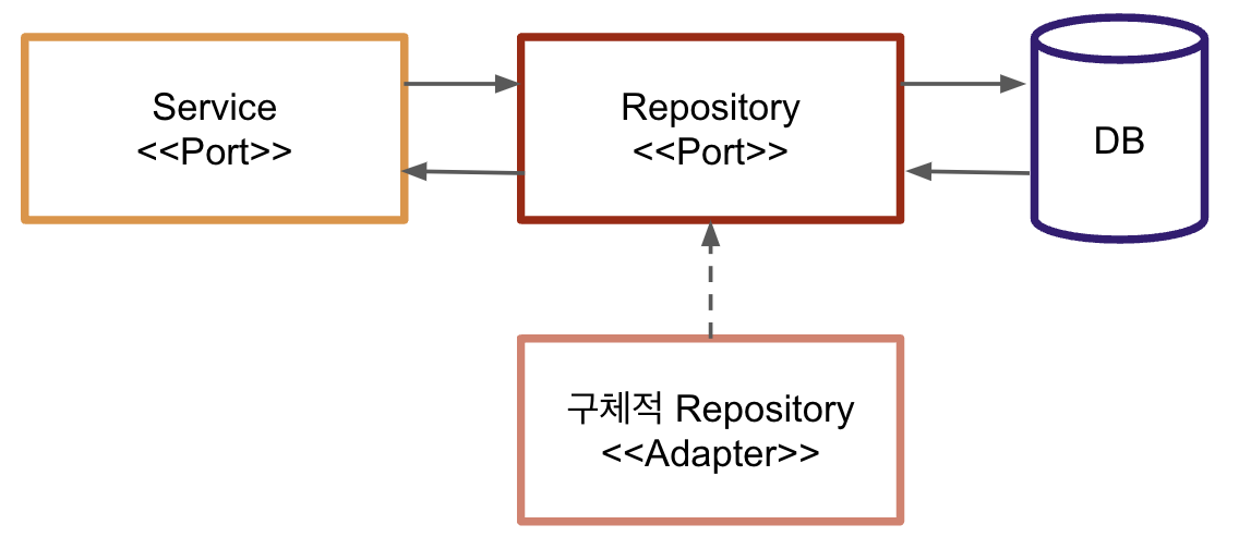 Repository는 인터페이스를 제공하므로 포트이고 이를 각 저장소에 맞게 구현한 구현체가 어댑터가 됩니다. 예를 들어 Redis와 프로토콜 통신을 하는 RedisRepository 구현체는 Repository 라는 인터페이스를 따르면서 내부적으로 Redis 프로토콜과 연결해주기 때문에 어댑터가 됩니다.