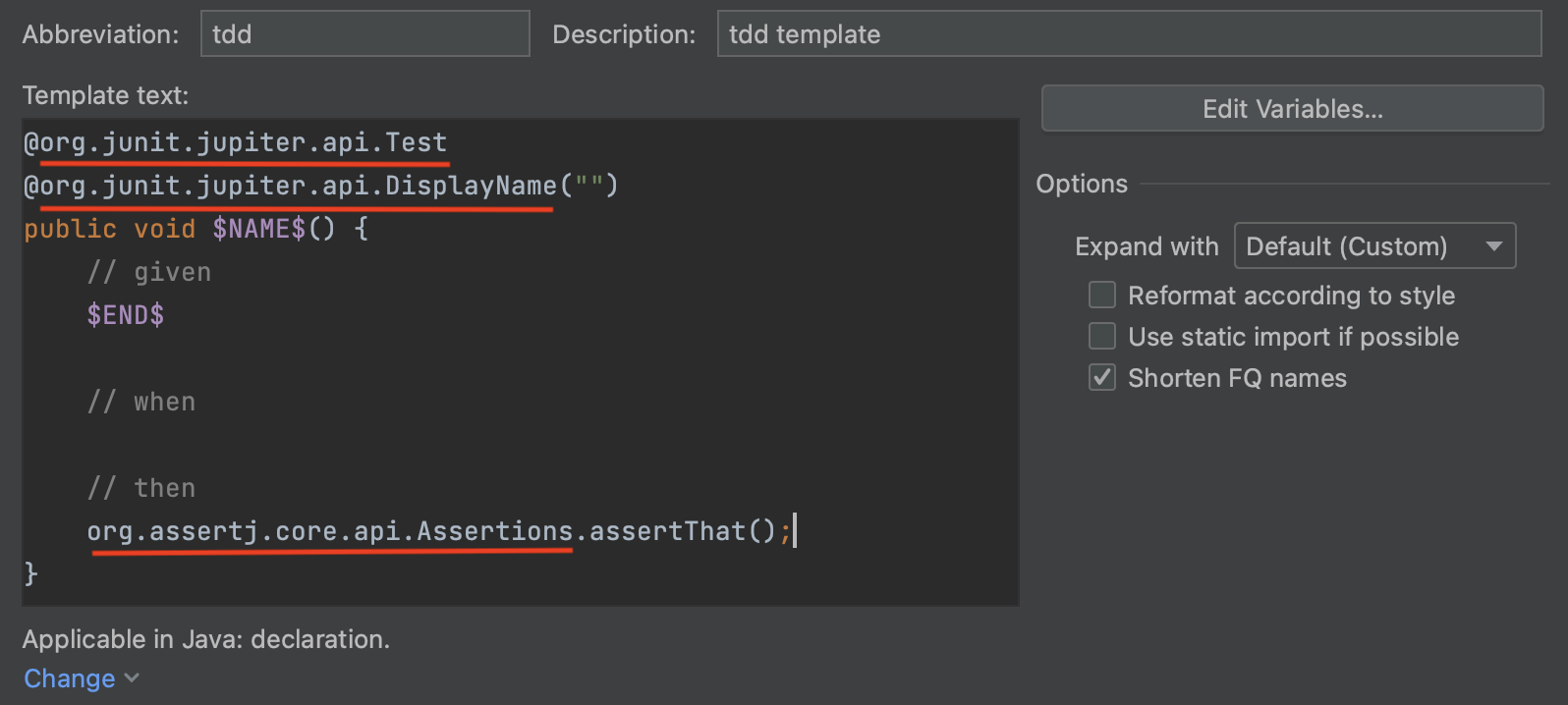 위 사진을 보면 @Test를 추가로 import 해야 합니다. 어떤 것을 import 할지 정해져 있다면 자동으로 import 하는 것이 편리합니다. 이때는 단축어 작성 시 full names으로 작성하고 Shorten FQ names 옵션을 켜주면 됩니다.