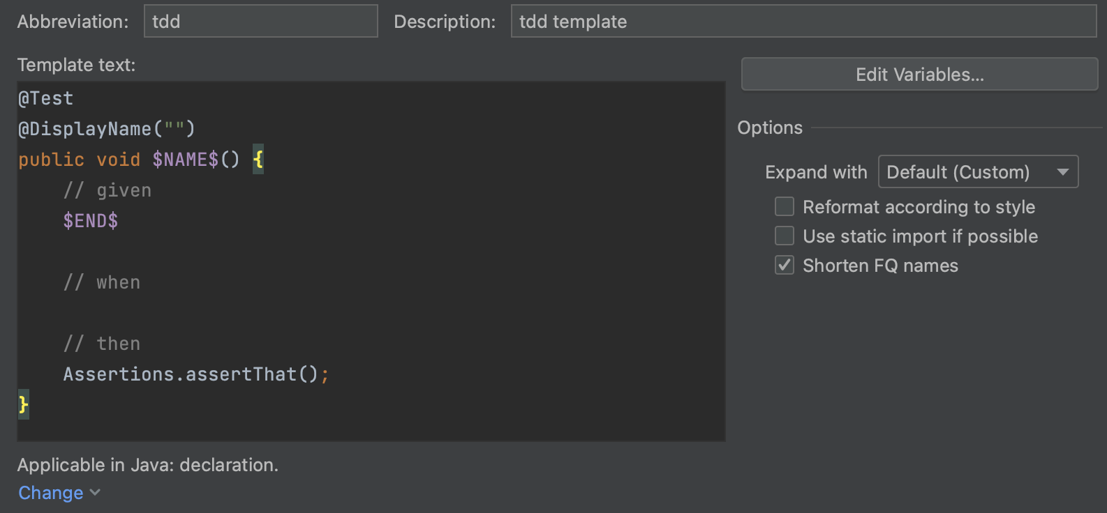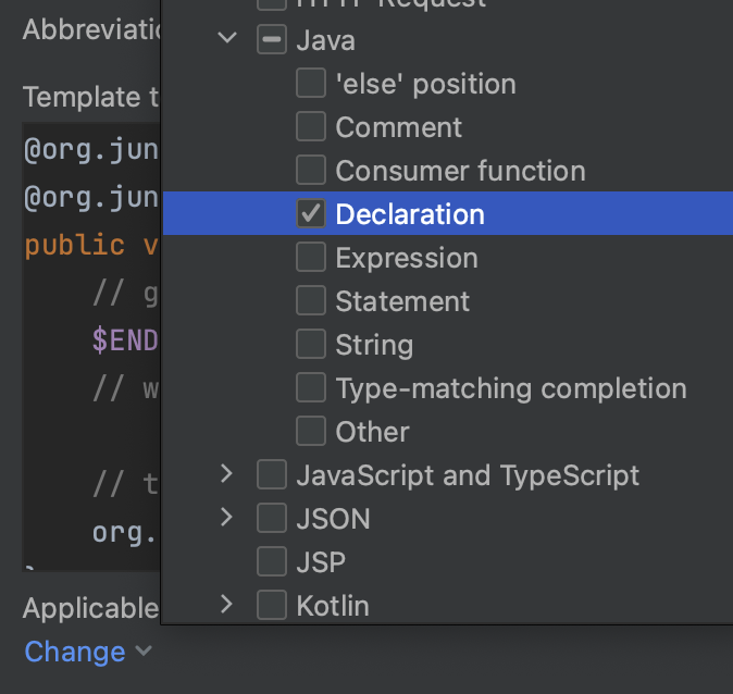 여기서는 method를 등록하는 것이라 Declaration을 선택했는데, soutv처럼 메서드 내에서만 사용할 거라면 Statement를 선택해도 괜찮습니다.