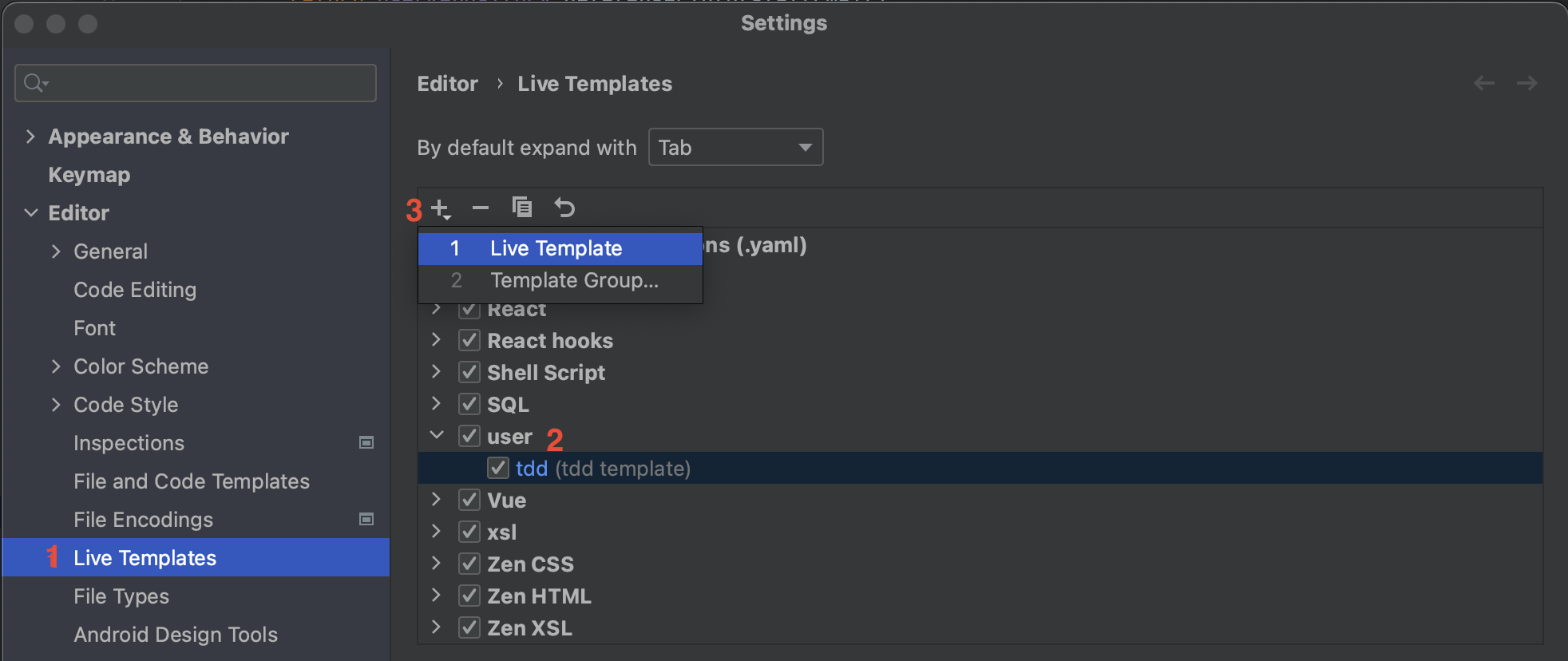 3. + 버튼 클릭 > Live Template 선택하여 추가