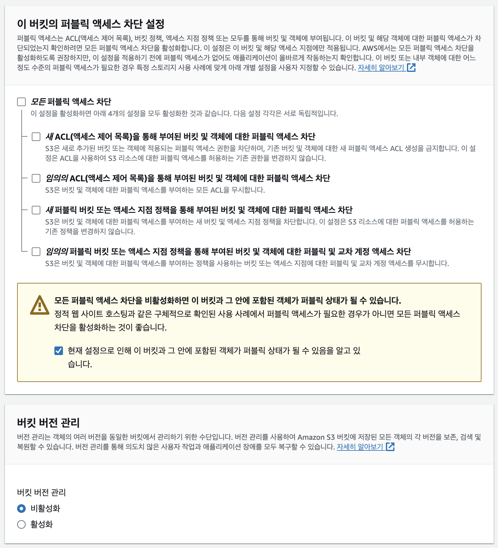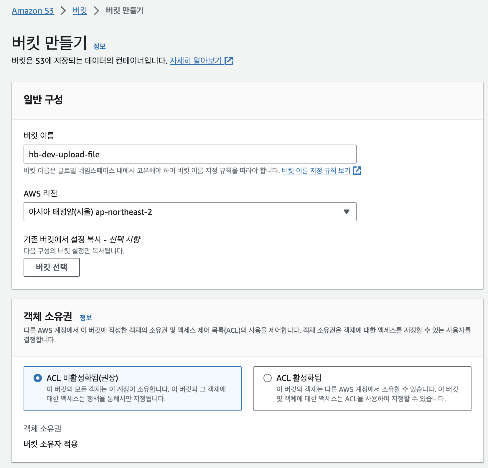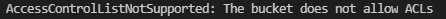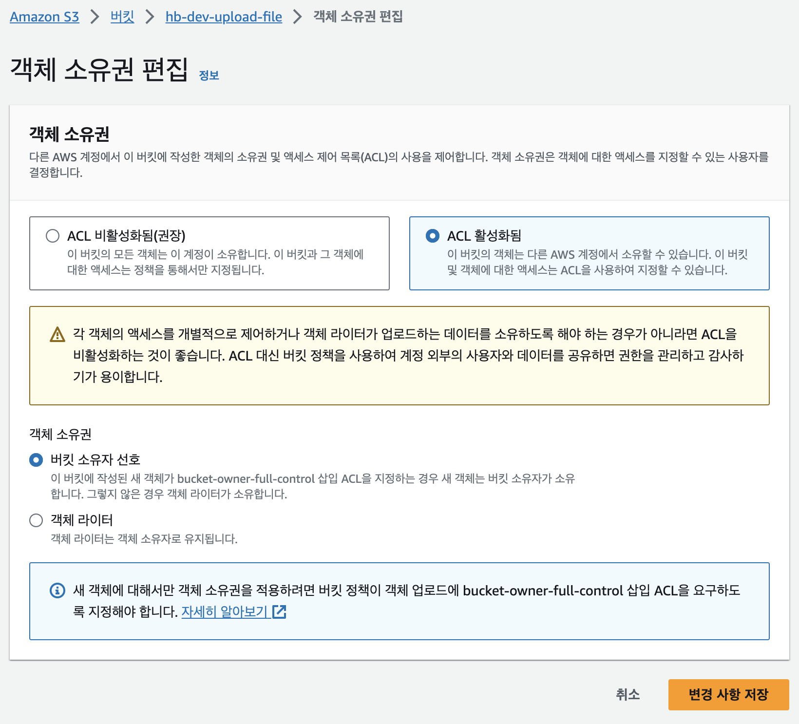 위와 같은 에러가 발생한다면 해당 버킷의 권한 > 객체 소유권을 편집하여 ACL을 허용해주어야 합니다.
