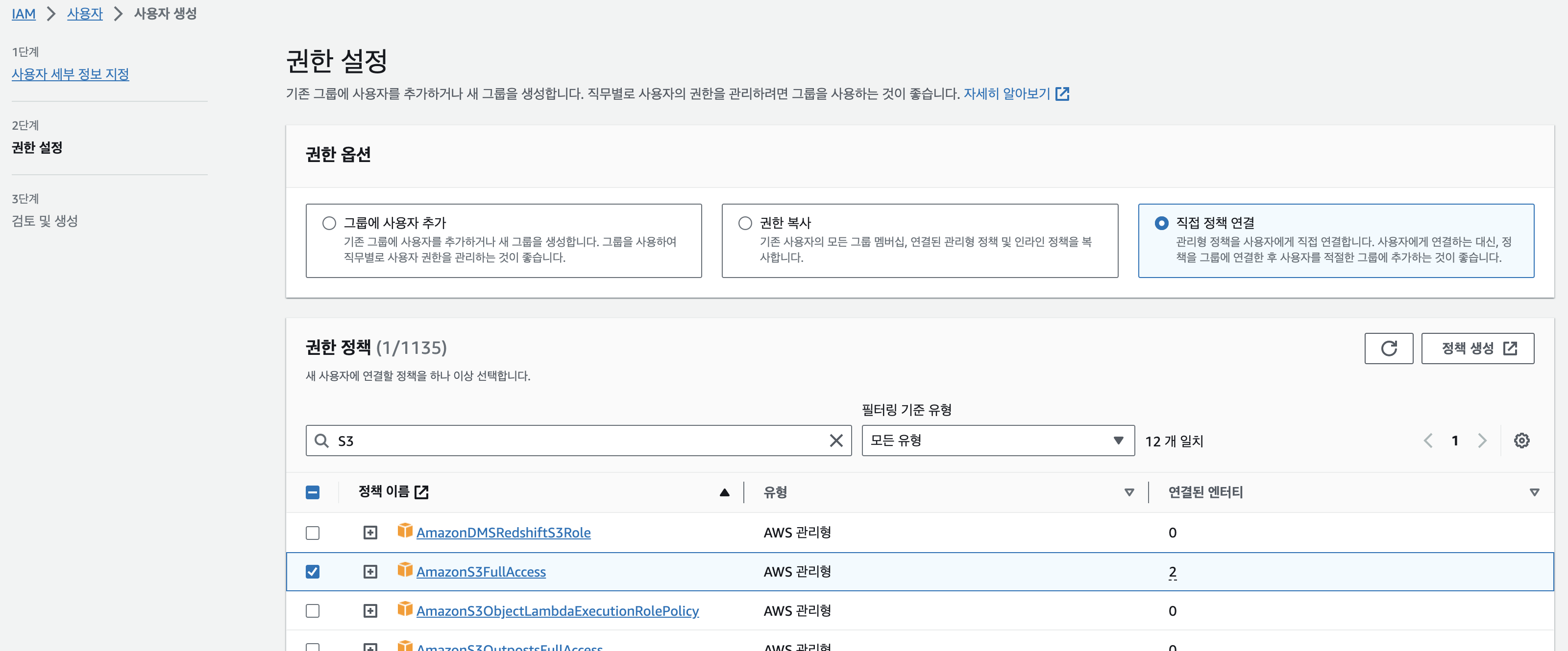 저는 개인적으로 사용하던 기존 User에 S3FullAccess 권한을 부여했습니다. (local AWS CLI를 통해 접근하는 User 또는 EC2에게 주어지는 Role에 권한을 추가해주면 됩니다.)