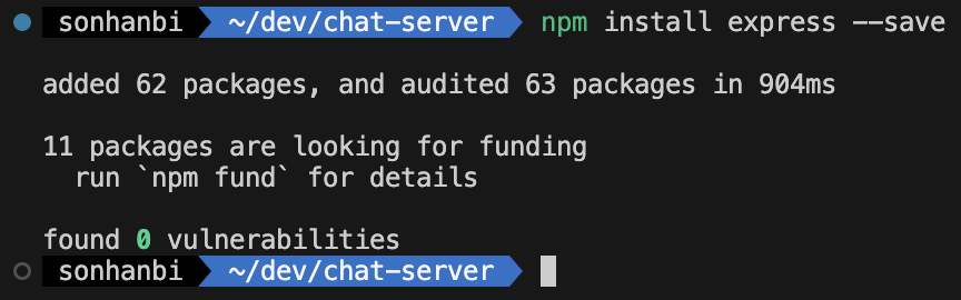 이후 해당 파일 디렉토리 내에서 다음과 같이 express 를 추가합니다.