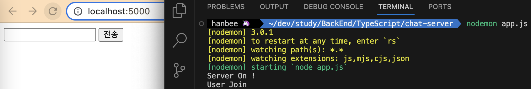 그리고 브라우저에서 localhost:5000 으로 접속하면 클라이언트인 chat.html 파일이 실행되고 이 클라이언트에서 localhost:5000 의 소캣에 접속하게 되어 최종적으로 콘솔을 통해 접속되었음을 확인할 수 있습니다.