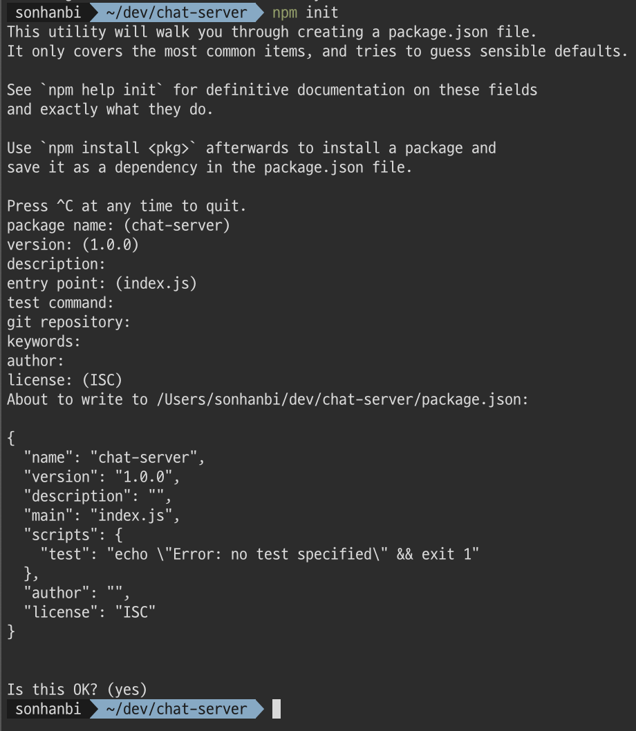 먼저 빈 디렉토리에 다음과 같이 node 프로젝트를 시작해줍니다. 여기서는 이미 node와 npm이 설치되어 있다고 가정하겠습니다. (node 설치와 관련된 내용은 다른 글들을 참고해주세요...!)