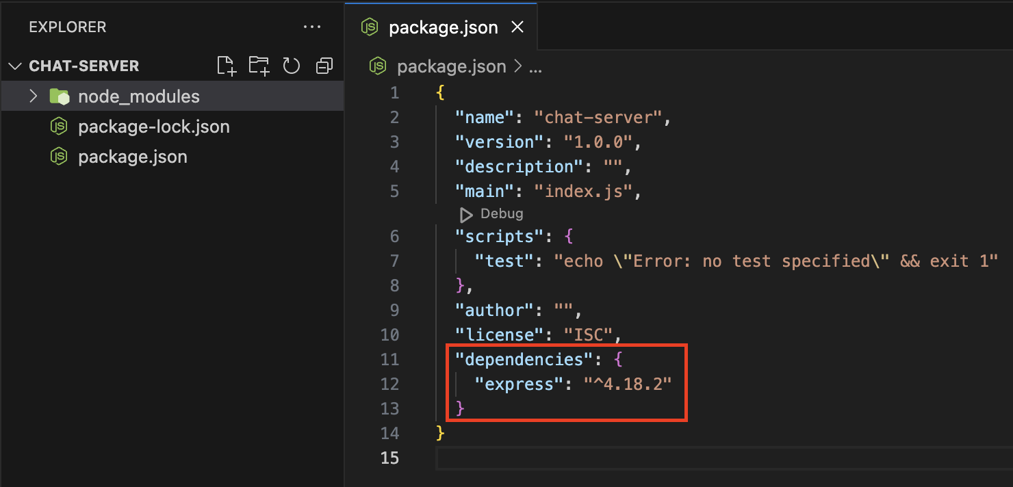 이렇게 하면 package.json에 express 가 추가된 것을 확인할 수 있습니다.