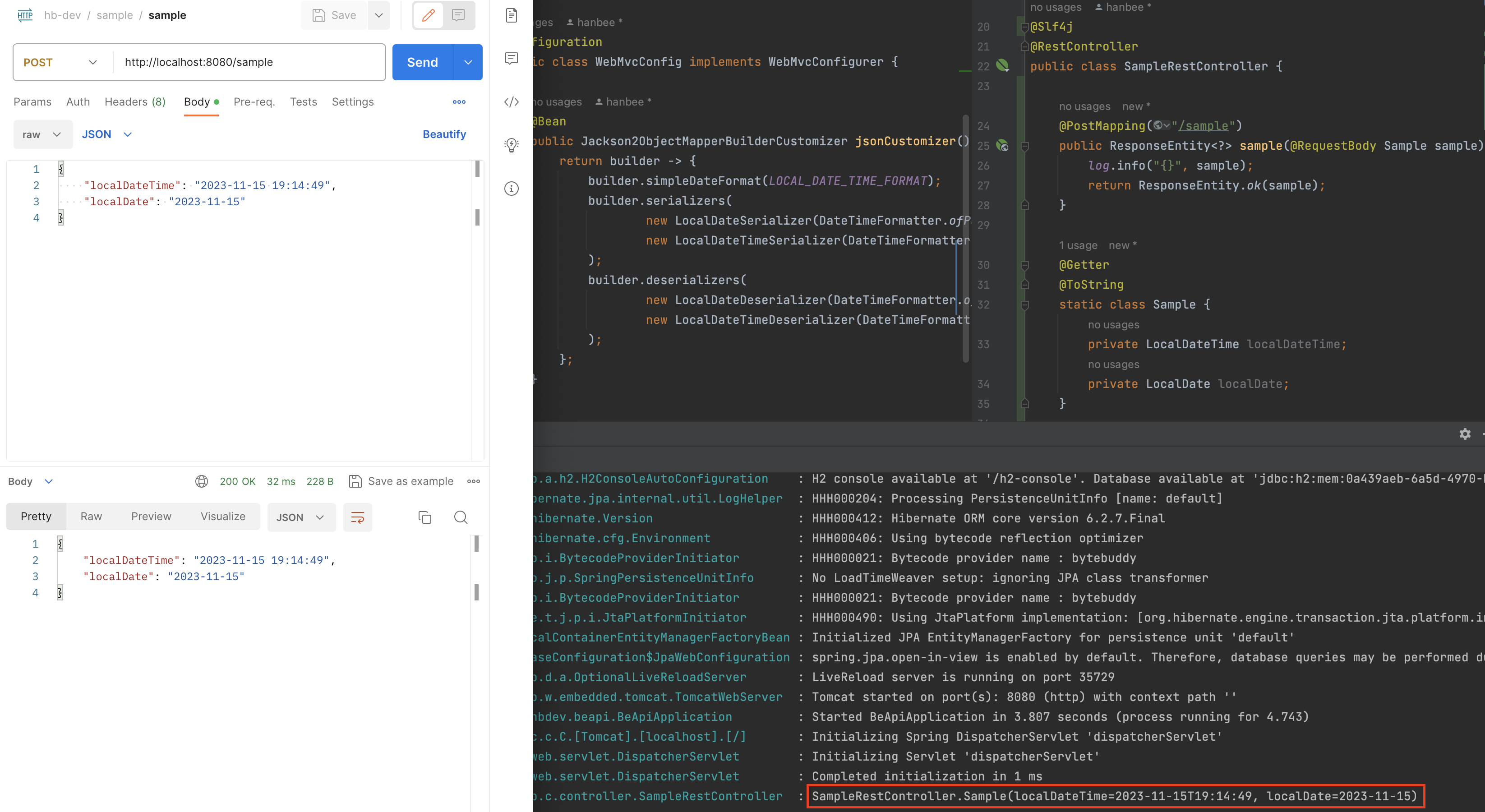 위와 같이 작성한 뒤에 아래와 같이 postman을 통해 Sample 을 RequestBody 로 보내고 다시 받으면 정상적으로 원하는 포맷에 맞게 데이터를 주고 받을 수 있습니다.