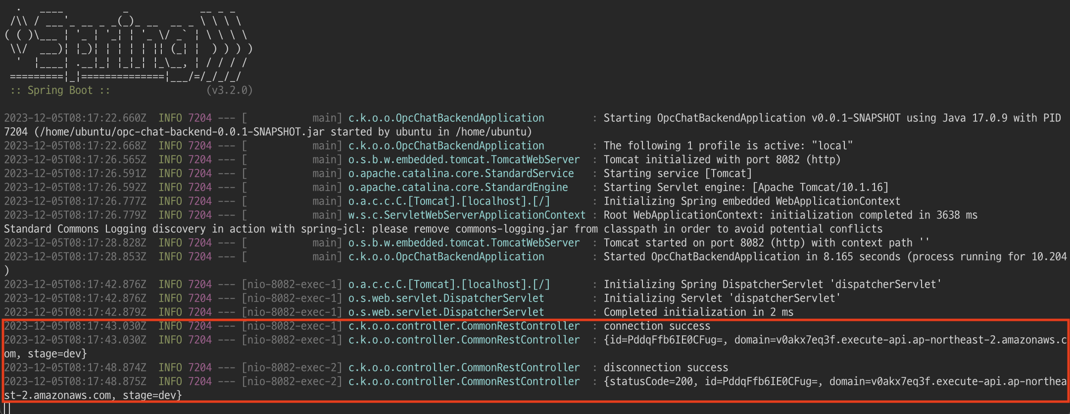 이제 다시 $connect, $disconnect를 하게 되면 API 서버에 로그가 찍히는 것을 확인할 수 있습니다.