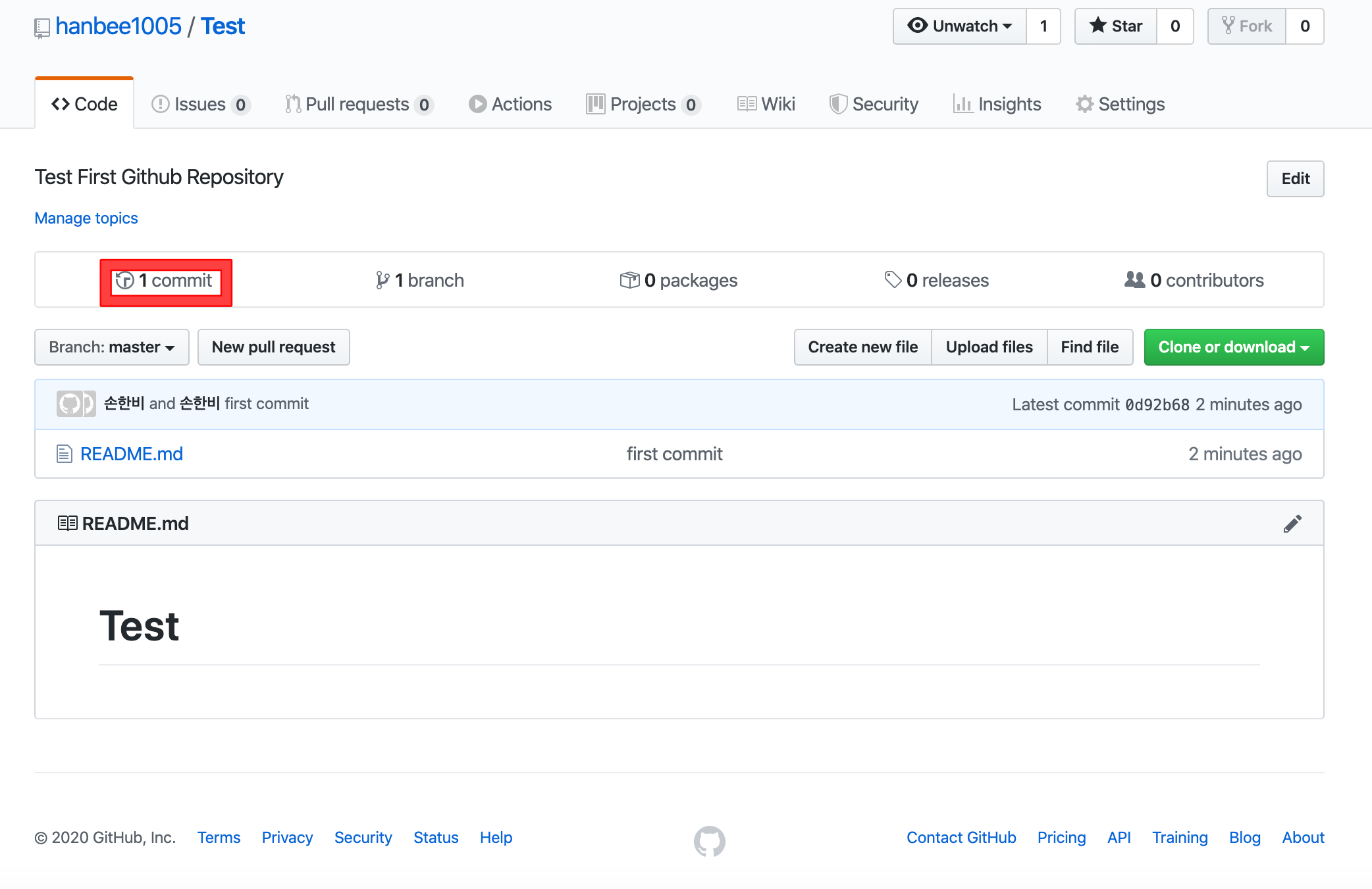 파일이 잘 올라간 것을 확인하고 commit도 꼭 확인해서 정확히 올라갔는지 확인한다. 지금은 그냥 처음 repository를 만들고 README.md 파일을 만들어서 올려보았다.