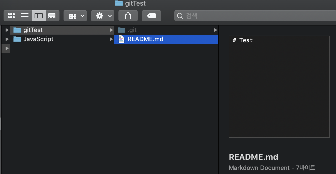 이전에 만들어 두었던 repository를 가져온 것인데 이곳에는 "# Test"라고 쓰여진 README.md 파일이 들어있다. git repository 프로젝트를 가지고 왔다면 해당 디렉토리에서 터미널을 연다.