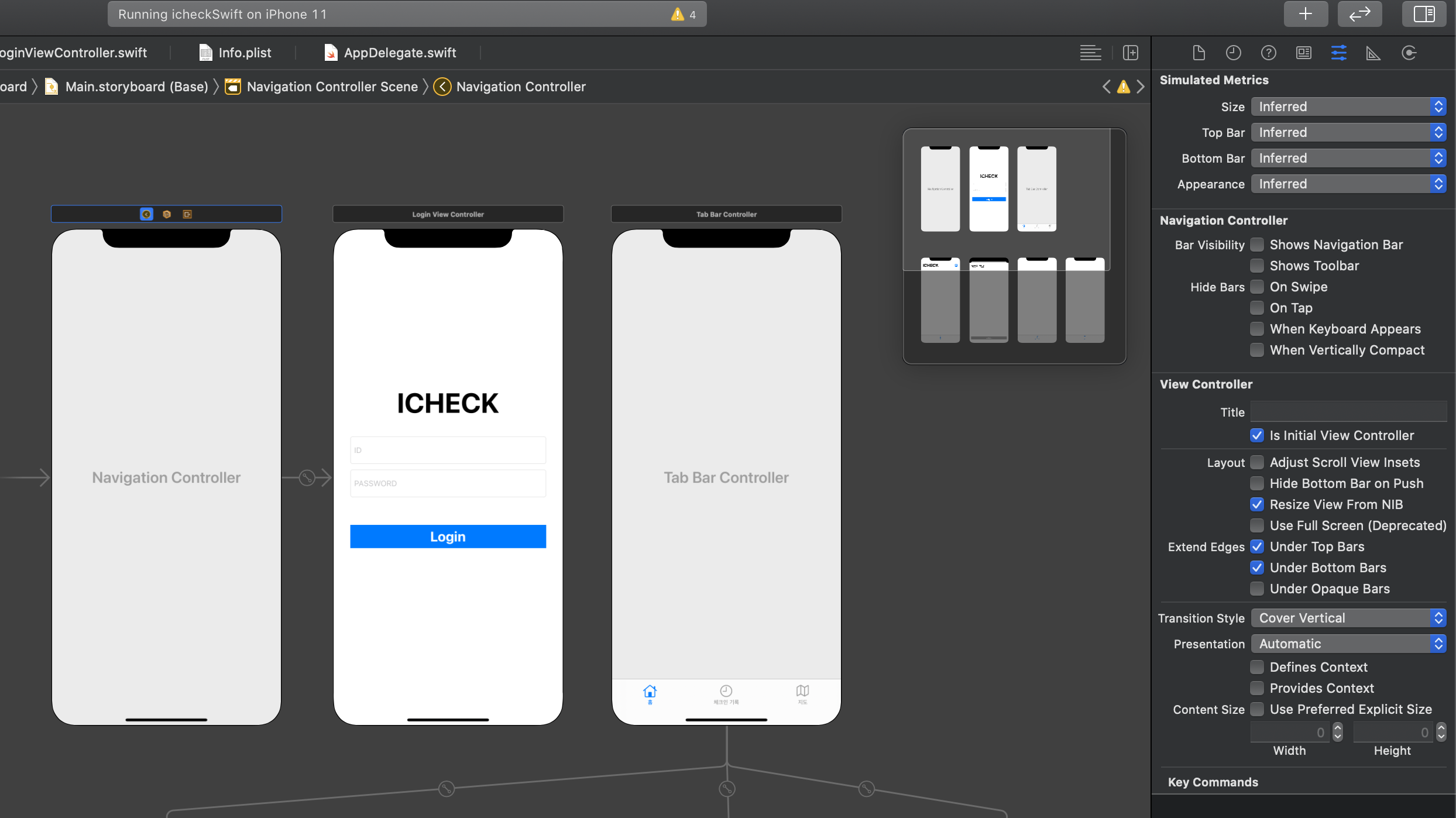 (1) 로그인 화면에 해당하는 LoginViewController 를 스토리보드에서 선택한 후 'Editor > Embed In > Navigation Controller' 를 선택하면 Navigation Controller 가 추가됩니다. (아래 사진은 이미 Navigation Controller 가 적용된 상태입니다...)