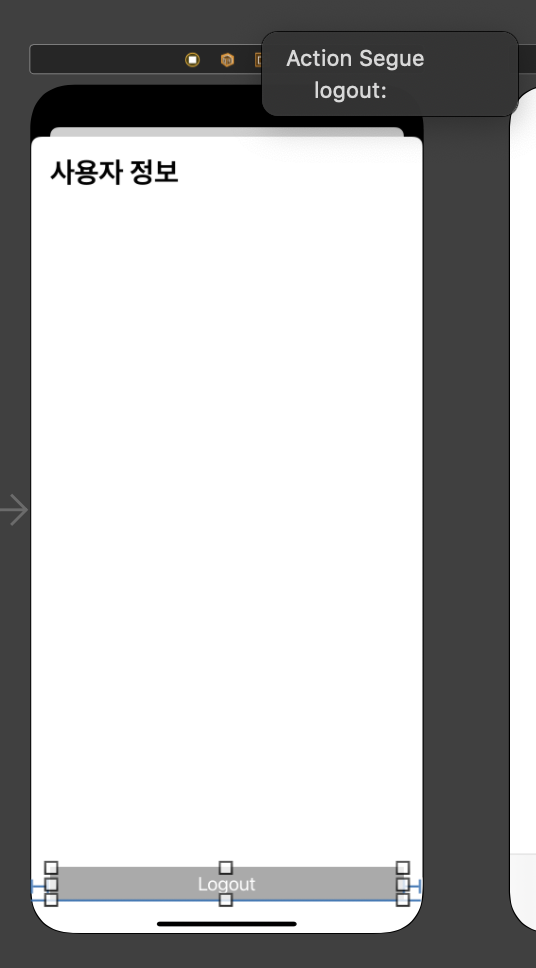 그런 다음 UserInfoViewController 에 있는 Logout 버튼을 control + 드래그 해서 Exit 아이콘에 연결하면 logout 메소드가 표시되는데 이 메소드를 클릭하면 연결이 됩니다.
