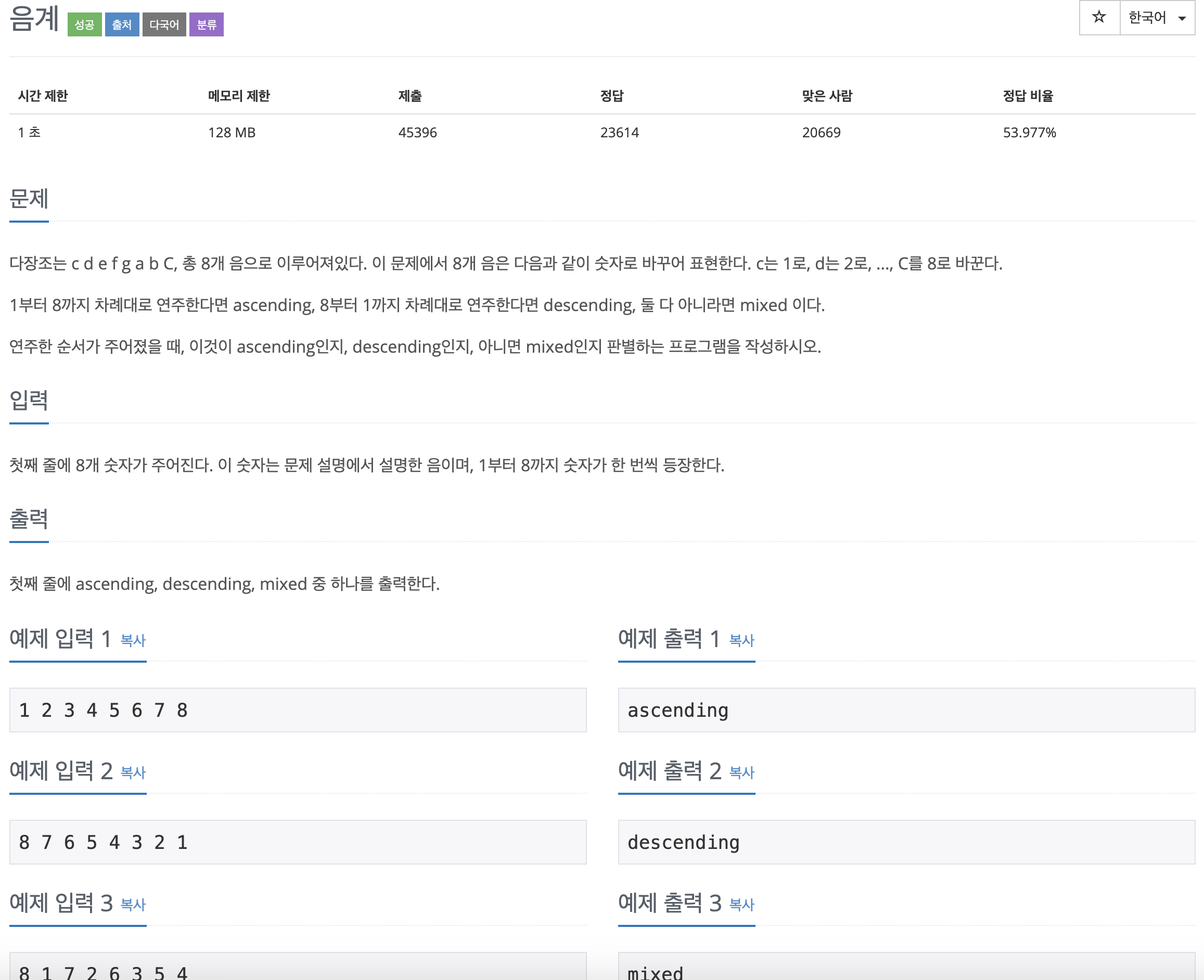 문제는 위와 같으며 ascending, desceding 변수를 선언하고 주어진 음계 배열에서 앞 음계가 뒤 음계보다 작으면(오름차순) descending 을 false 로 크면(내림차순) ascending 을 false 로 만듭니다. 결과 출력 시 ascending, descending 중 true 인 값을 출력하고 둘다 false 인 경우 mixed 를 출력하도록 구현하였습니다.