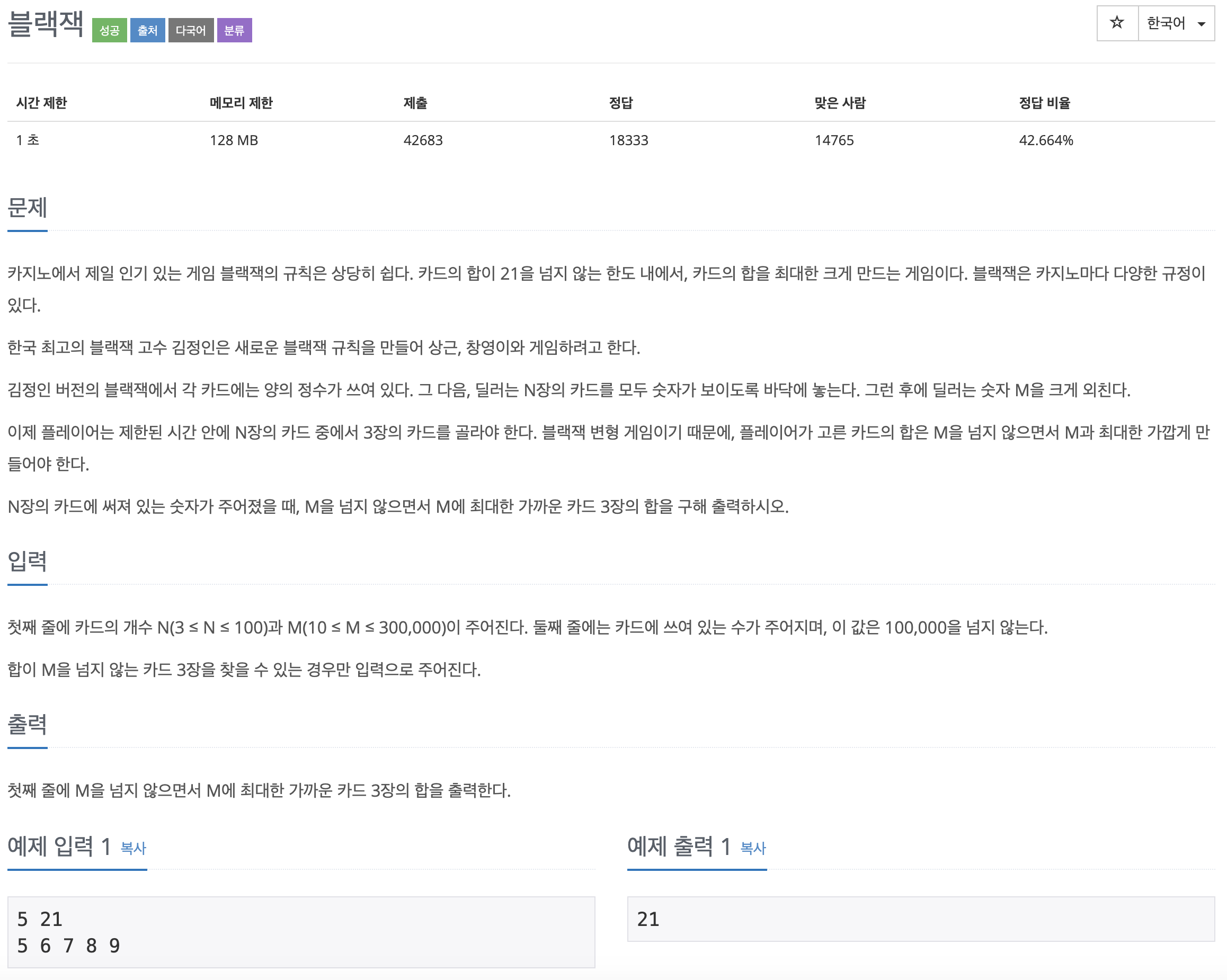 문제는 위와 같으며 우선 주어지는 카드의 수가 100 이하이기 때문에 단순하게 모든 경우의 수를 다 구하는 3중 for 문을 사용하여 문제를 풀었습니다.