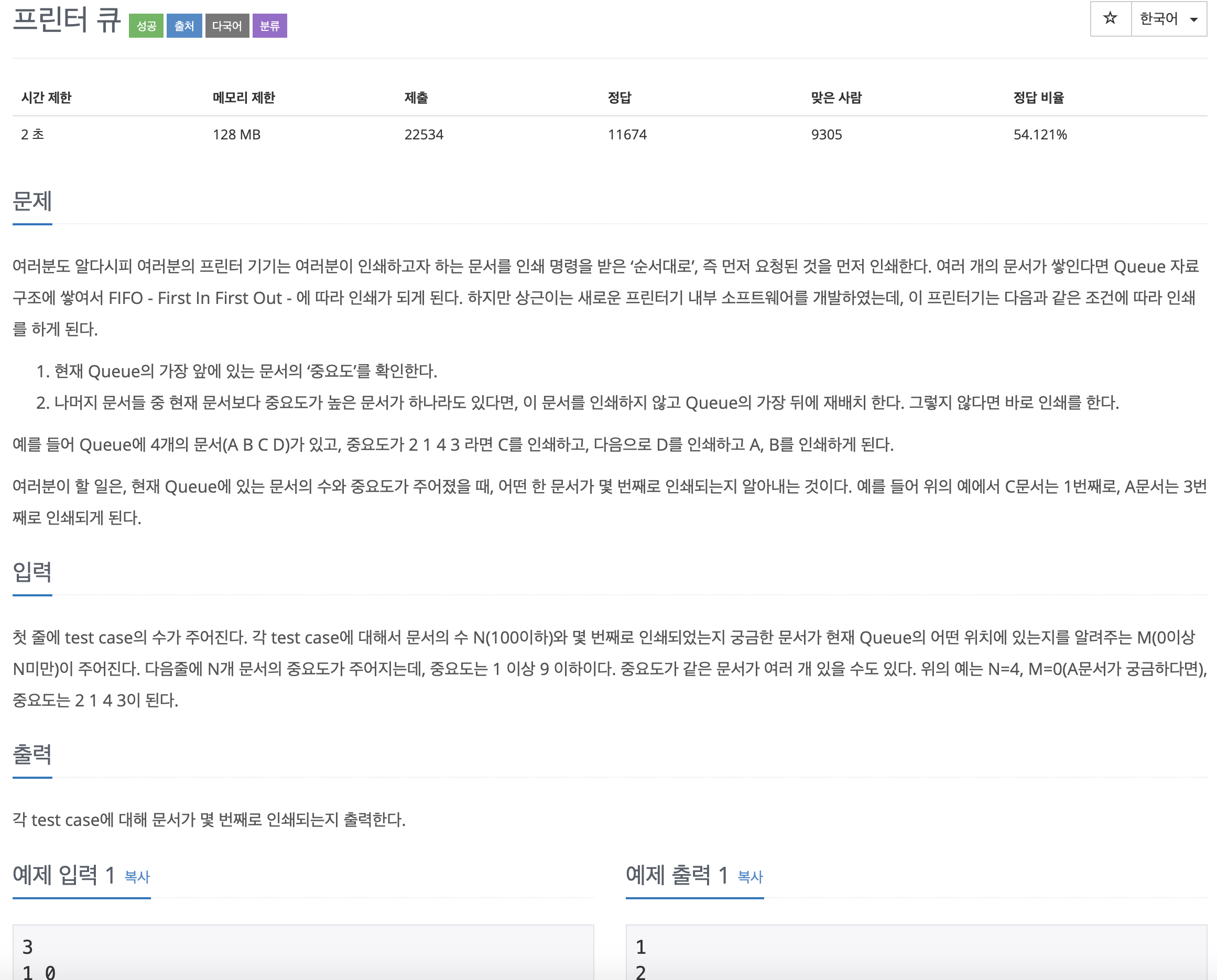 문제는 위와 같고 (우선순위, 인덱스) 형태의 튜플을 리스트로 저장한 뒤, 앞에서부터 차례대로 꺼내서 우선순위가 최대인지 확인합니다. 우선 순위가 최대라면 먼저 출력 count 를 1 추가한 뒤, 원래 뽑으려고 한 인덱스가 맞는지 확인하여 맞다면 그대로 출력 count 를 프린트하고 종료합니다. 아니라면 그냥 pop(0) 합니다. 맨 앞에서 꺼낸 데이터의 우선순위가 최대가 아니라면 해당 데이터를 다시 리스트의 젤 마지막에 추가합니다.