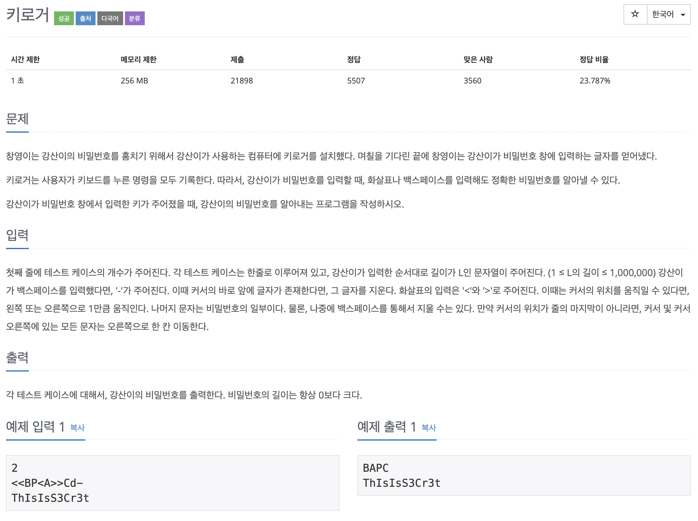 문제는 위와 같으며 처음에는 커서의 위치를 변수로 가지고 있고 화살표 입력 등에 따라 커서를 이동시키면서 비밀번호를 찾는 방식을 사용하였습니다. 하지만 이렇게 한 경우에는 시간 초과가 발생하였습니다. 그래서 커서를 이동시키지 않고 커서를 기준으로 왼쪽 문자를 담는 배열과 오른쪽 문자를 담는 배열을 따로 선언하는 방식으로 구현하였습니다.