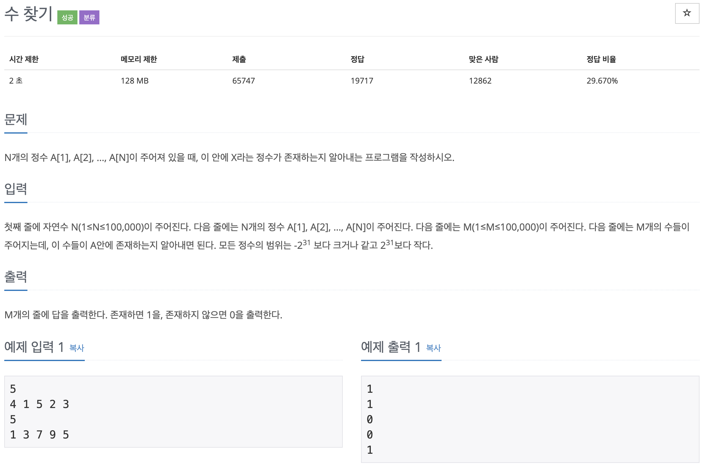 문제는 위와 같고 처음에는 이진 탐색 방식으로 풀었다가 시간 초과가 나서 주어지는 N 개의 정수를 담는 Set 을 만든 뒤 그 안에 X 정수가 존재하는지를 알아내는 방식으로 구현하였습니다.