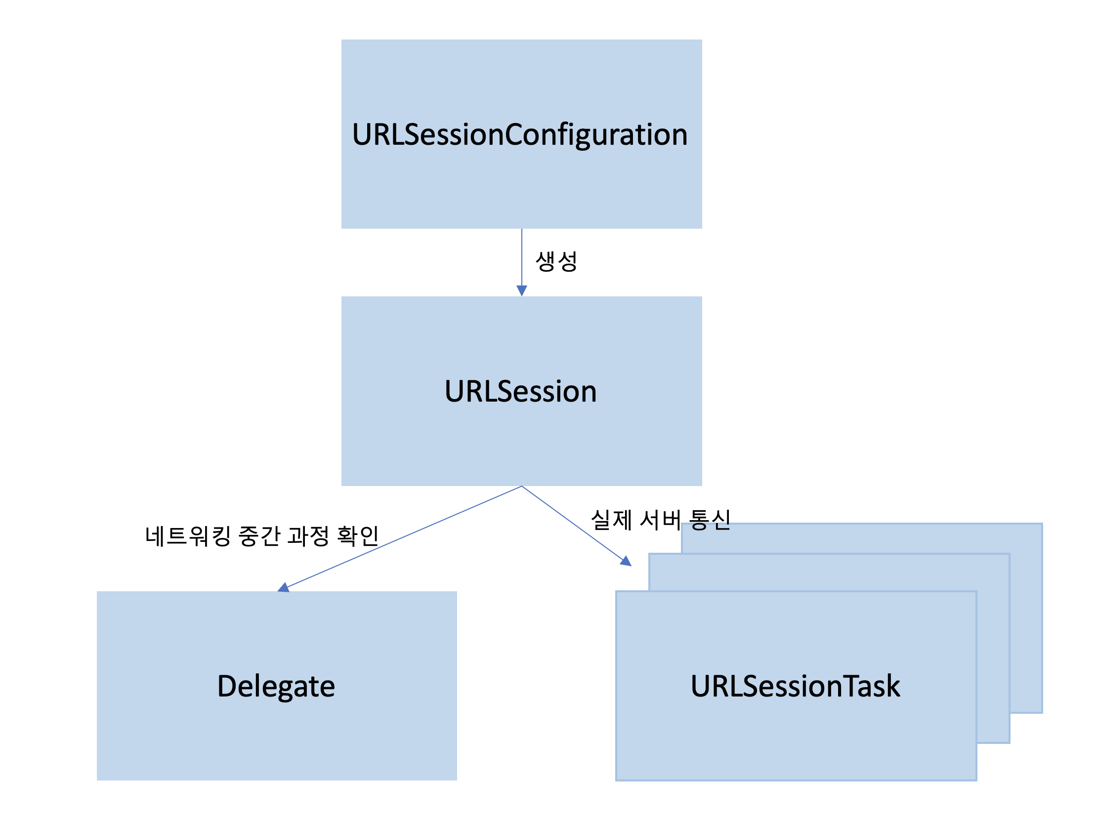 위와 같이 다양한 방법으로 생성한 URL 로 HTTP 통신을 하기 위해서는 URLSession 을 이용합니다. URLSession 은 URLSessionConfiguration 을 통해 생성이 되고 이 URLSession 은 URLTask 를 통해 실제 서버 통신을 하게 됩니다.