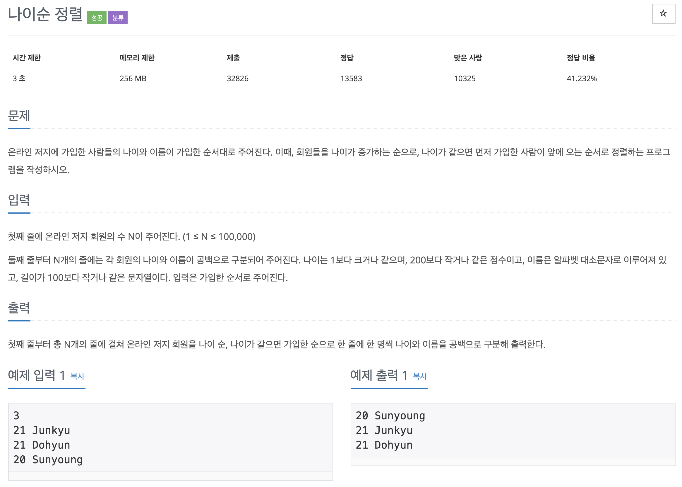 문제는 위와 같으며 데이터를 튜플로 저장하고 기본 sort() 메소드를 통해 나이순을 기준으로 정렬하여 문제를 해결하였습니다.