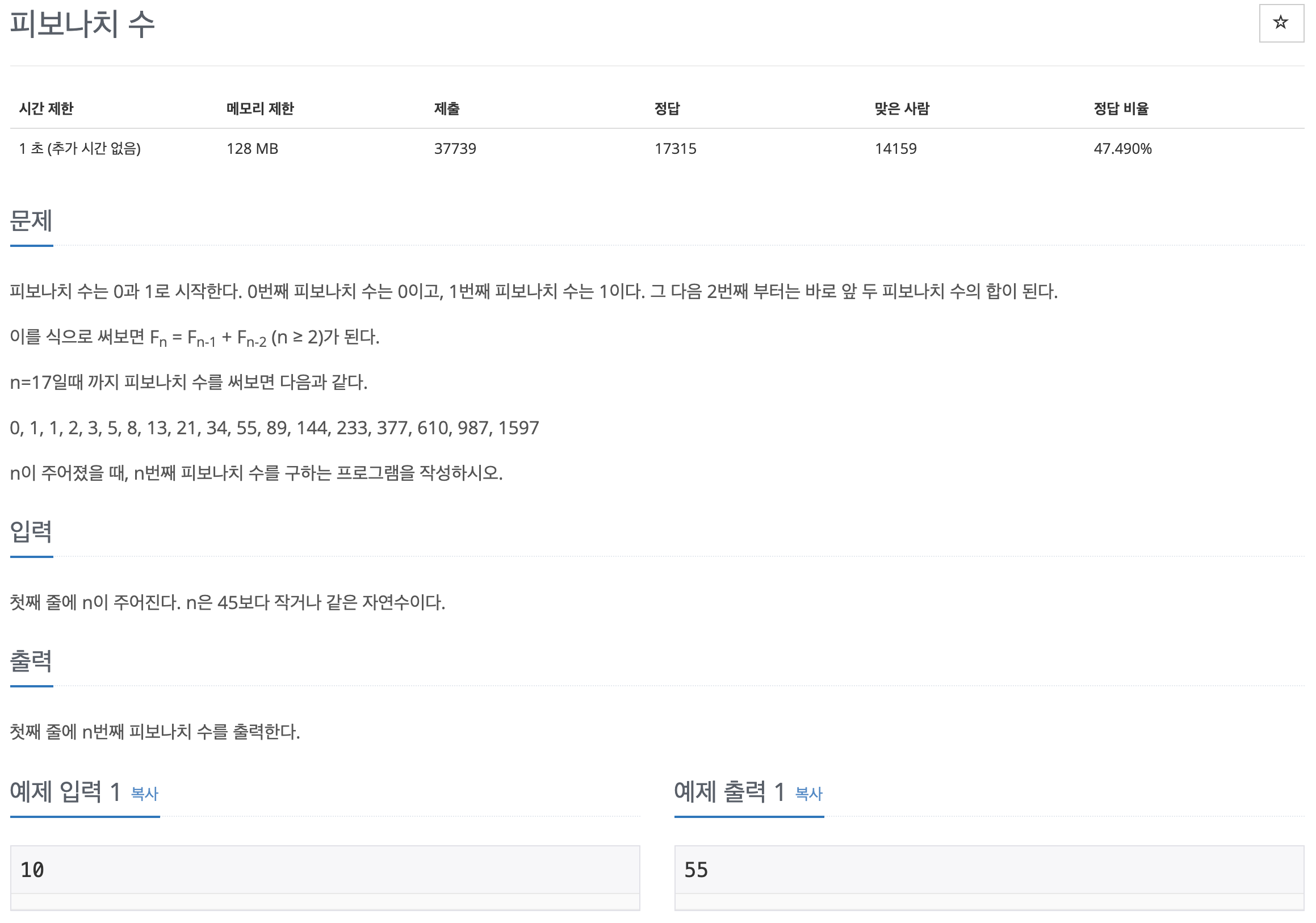 문제는 위와 같으며 피보나치 수는 대표적인 재귀 문제이기 때문에 처음에 재귀 방식을 사용하였지만 시간 초과가 발생하여 단순히 for 문을 돌면서 문제를 해결하였습니다.