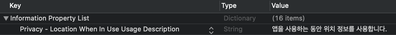 1. info.plist 를 열어 "Privacy - Location When In Use Usage Description" 를 추가합니다.