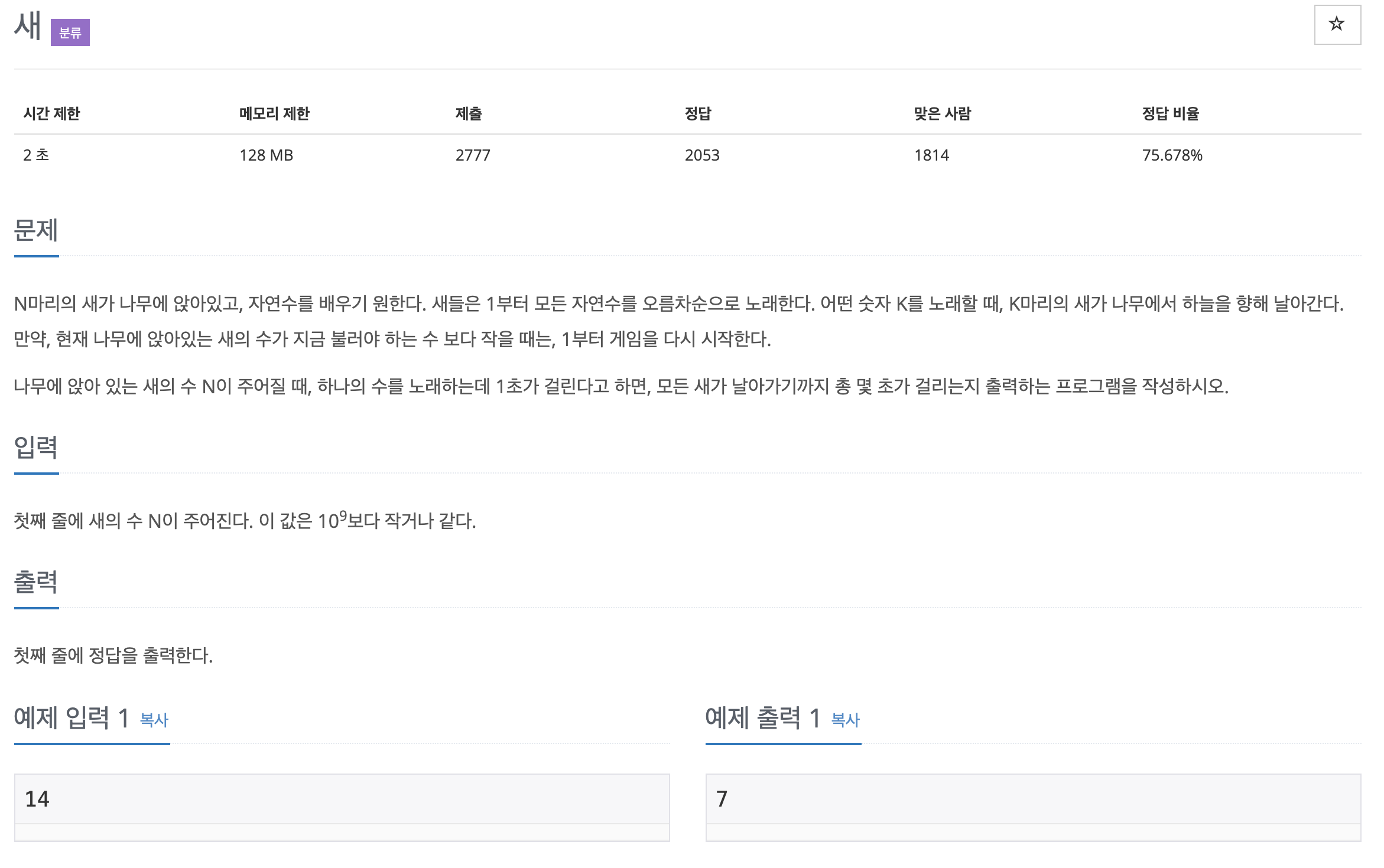 문제는 위와 같으며 단순하게 새의 숫자가 0이 될때까지 반복하여 자연수를 빼주면 해결할 수 있습니다. 단, 자연수가 남은 수의 새보다 커지는 경우 자연수를 다시 1로 변경해야 합니다.