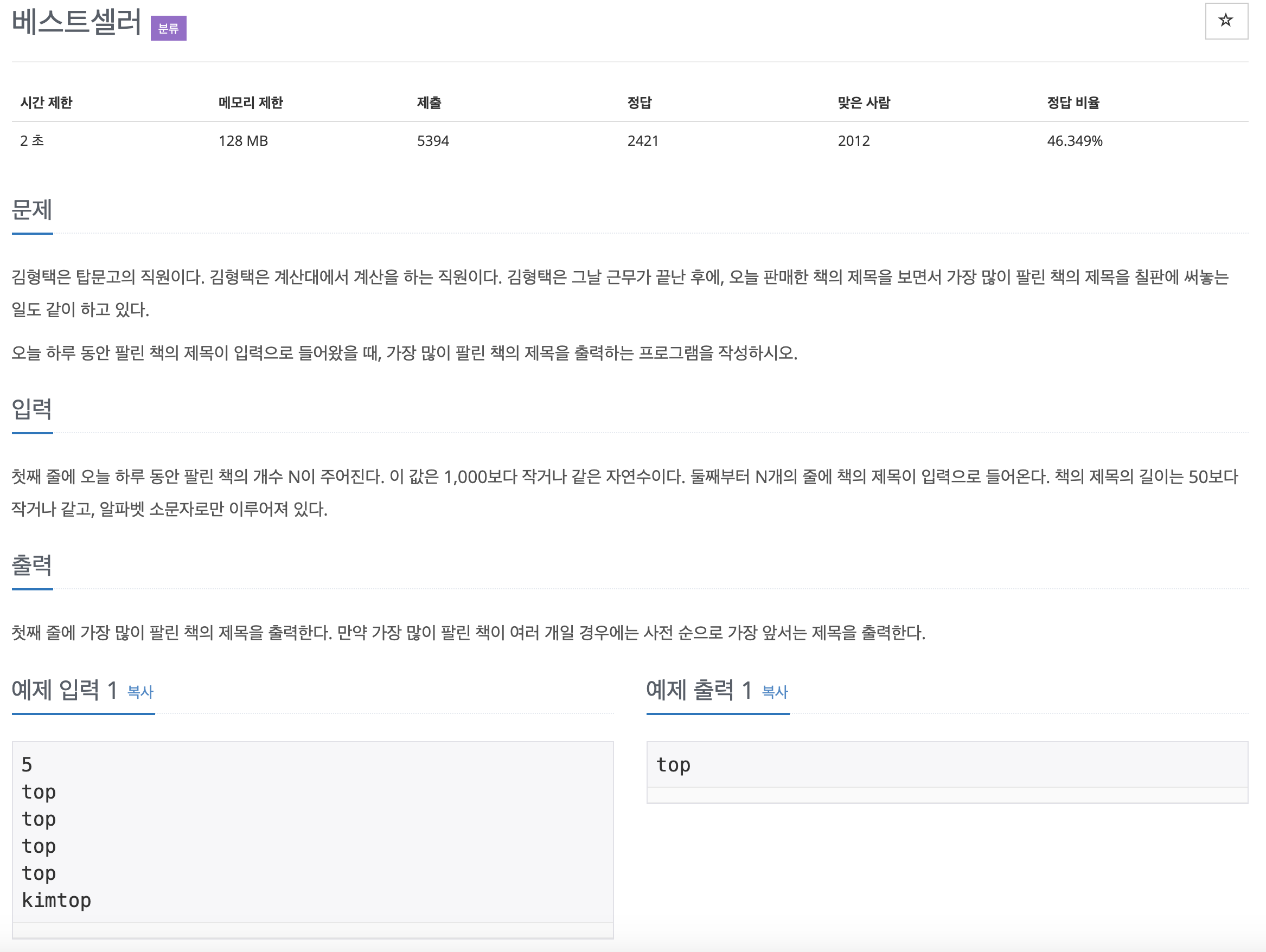 문제는 위와 같으며 책을 입력 받아 제목을 키로 하고 해당 책이 팔린 횟수를 값으로 하는 딕셔너리를 생성한 뒤, 먼저 횟수를 기준으로 정렬하고 횟수가 같으면 제목을 사전 순으로 정렬하여 문제를 해결할 수 있습니다.