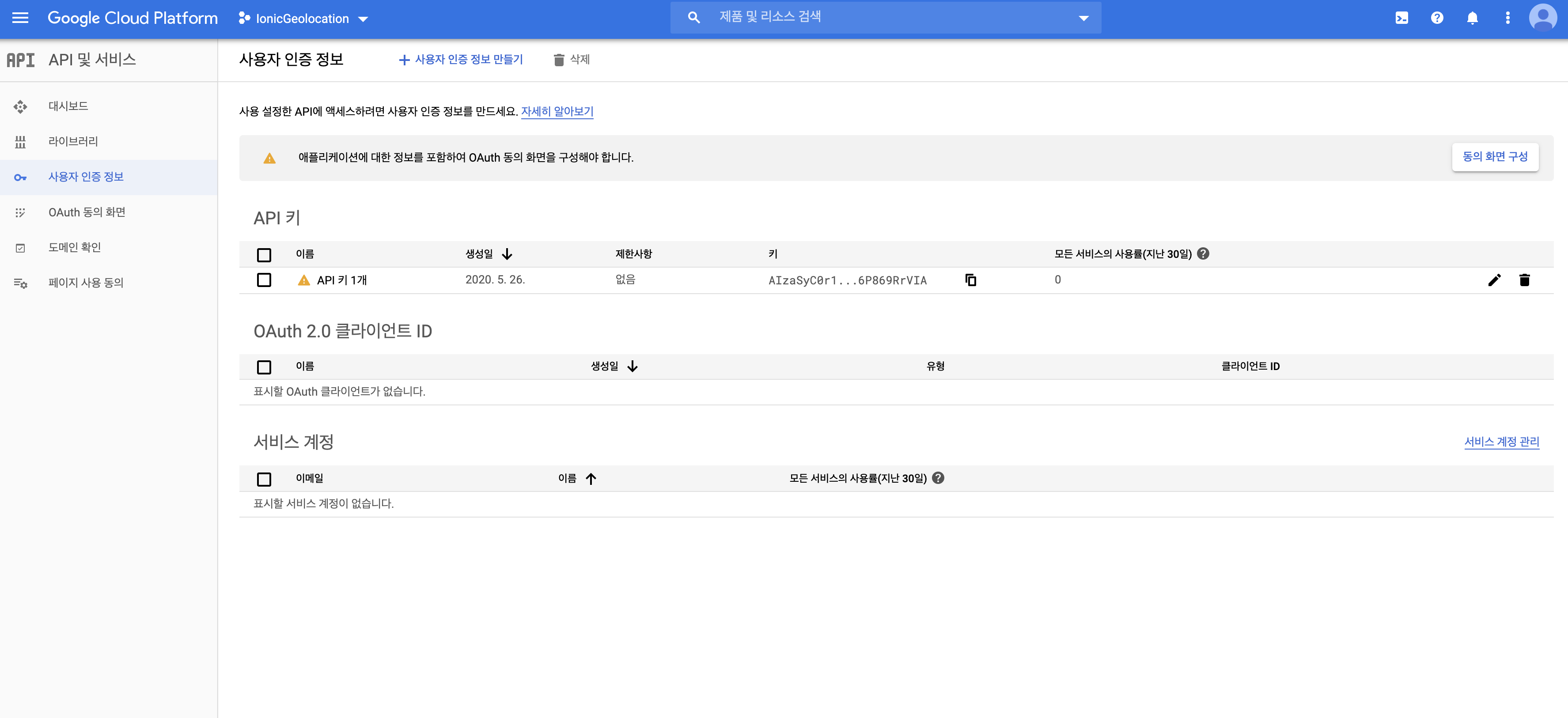(4) 다음 안내를 따라 "사용자 인증 정보"에서 "+ 사용자 인증 정보 만들기"로 API Key를 생성한다.