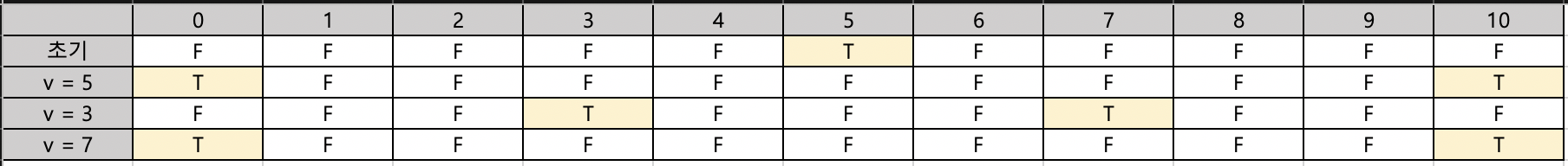 1. 길이가 0부터 11(m+1)까지인 배열을 만들고, 처음 볼륨이 5 이므로 인덱스가 5인 경우만 True 로 지정합니다.