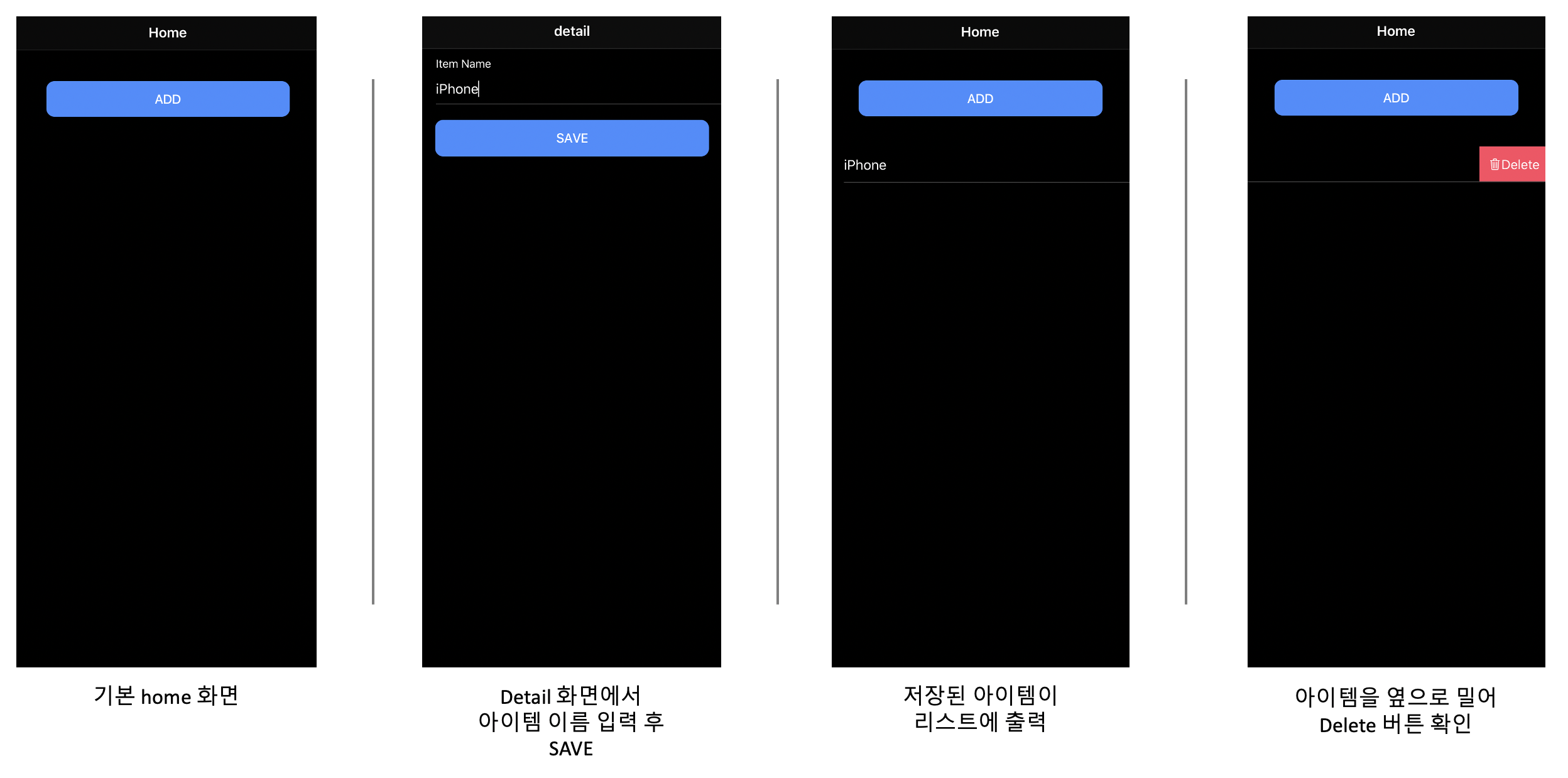 home page가 처음 실행되면 storage 서비스에서 제공하는 getItemList() 함수를 사용하여 Local Storage로부터 itemList를 가져온다. ADD 버튼을 클릭하면 NavController를 사용하여 detail page로 이동한다.