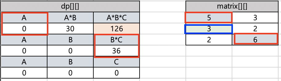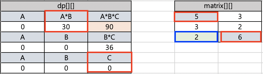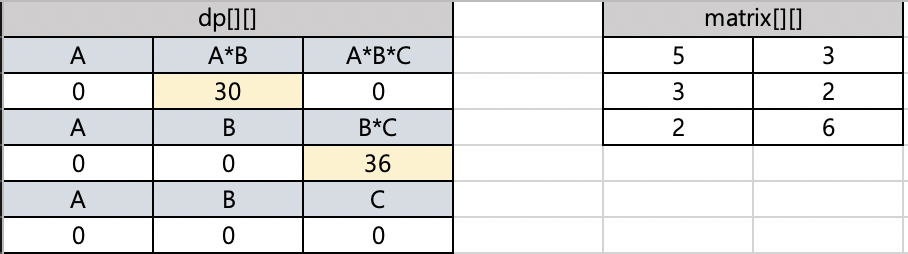 예제를 살펴보면 먼저 행렬(matrix)을 [[5, 3], [3, 2], [2, 6]] 으로 저장하고 순차적인 행렬의 곱을 나타내는 dp 이차원 배열에 dp[i][i + 1] = matrix[i][0] * matrix[i][1] * matrix[i+1][1] 값을 저장합니다.