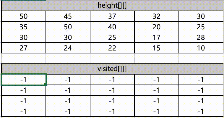 문제는 위와 같으며, 지점의 높이를 이차원 배열로 저장하고 해당 배열과 동일하게 특정 위치를 방문했는지 알 수 있는 배열을 생성한 뒤 -1로 초기화 합니다.